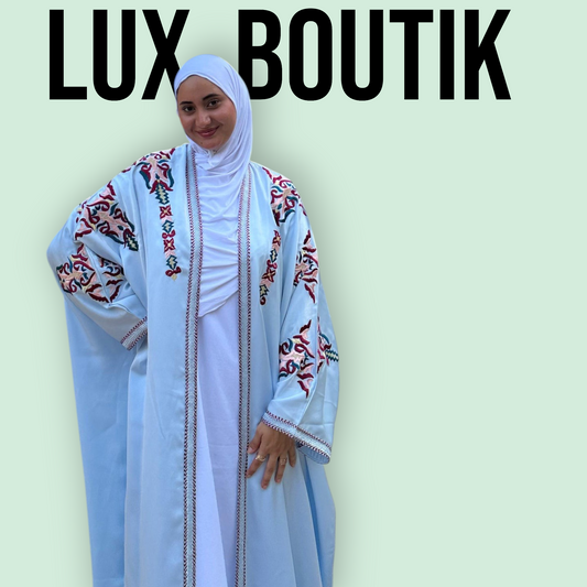 Kimono Bleu Ciel Brodé – Élégance Marocaine et Confort Luxueux